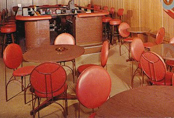 Description: View of the Flying Dutchman Bar and Mural. The Flying Dutchman Bar & Outdoor Garden as well as the furniture was designed by William Wesley Peters in 1960. The mural was designed by Eugene Masselink.