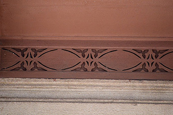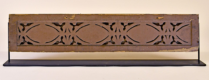This panel was originally located beneath the inset balcony on the second level of the front facade, just above the front entrance. There are eight columns supporting the roof of the projecting portion of the balcony. Beneath each column under the balcony are eight decorative “supports”. Between each support, directly above the entrance are seven fascia. This piece is one of the seven fascia pieces. This design appears on the ends and three sides as-well-as the back space between the supports. A similar design is on the front facade of the balcony and is repeated seven times. In 1986 the Charnley Residence was purchased by the architectural firm of Skidmore, Owings and Merrill and subsequently went through an extensive renovation. This piece was removed during the renovation.