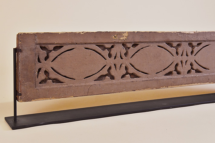 This panel was originally located beneath the inset balcony on the second level of the front facade. There are eight columns supporting the roof of the projecting portion of the balcony. Beneath each column under the balcony are eight decorative “supports”. This piece is one of eight end caps. This design appears on the ends and three sides as-well-as the back space between the supports. A similar design is on the front facade of the balcony and is repeated seven times. In 1986 the Charnley Residence was purchased by the architectural firm of Skidmore, Owings and Merrill and subsequently went through an extensive renovation. This piece was removed during the renovation.