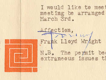 Their relationship was quite tumultuous. Wright explains in his Autobiography that he married her to rescue their relationship. "Marriage resulted in ruin for both. Instead of improving with marriage, as I had hoped, our relationship became worse." (An Autobiography, p 260). They quarreled a great deal, she was addicted to morphine, and in less than a year they were separated. In 1924, after the separation, but while still married, Wright met Olgivanna at the Petrograd Ballet in Chicago. On November 27, 1925 Miriam filed for a divorce, alleging desertion and cruelty. After a three year legal battle, they were divorced on August 26, 1927. Olga and Frank were married on August 25, 1928 at midnight in Rancho Santa Fe near La Jolla. The ceremony was held one year to the day after Wright's divorce from Miriam... Continue...Text of letter: