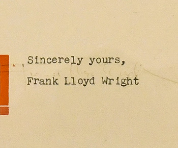 Typed: “Dear Sirs: – Please send us a catalog of Siphon Intermittent Discharge Sewage Tanks. Yours truly, Frank Lloyd Wright. Flush Tank Co., Aurora, Illinois. Feb. 17, 1903.” Under the typed name of Frank Lloyd Wright, there are three initials written in pencil: “WBG.” Walter Burley Griffin was an integral part of the Wright Studio from 1901 to 1905, Prairie Style, Legler, 1999, p.200