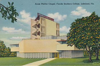 Description: Verso: "Annie Pfeiffer Chapel, Florida Southern College, Lakeland, Florida." "LK. 4 - Ridge Distributing Co., P. O. Box 382, Lakeland, FLA." "Natural Color Reproduction - Curteichcolor ® Art-Creation Reg. U. S. Pat. Off." Place Stamp Here 6C-K884 (dates this card 1956).