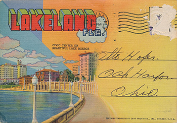 Description: Postcard folder of Lakeland, Florida. Eighteen accordion fold postcard images. Four are of Florida Southern College, two of Frank Lloyd Wright designed building. Annie Pfeiffer Chapel (1B-H1041) (S#0571.04) and Administration Building (S#0798.08). Text on folder: “Lakeland News Co., Lakeland, Fla. Genuine Curteich-Chicago "C.T. Art-Colortone" Creation. D-7129.” D-7129 dates this folder 1941.
