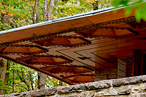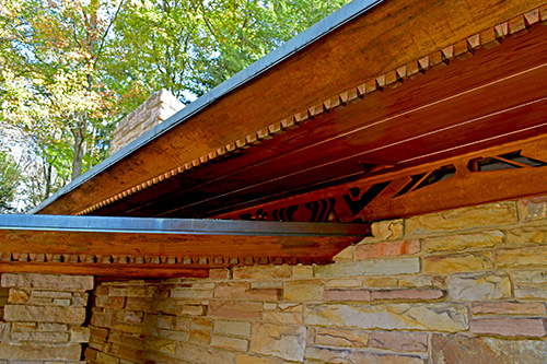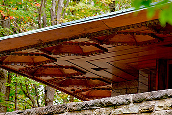 Description: View of the roof overhand cantilevered off the end of the Living Room. Designed by Frank Lloyd Wright in 1954. Text on sleeve: "Wright, F. L. - Hagan House, 4-13. I. N. Hagan House. (d) roof overhang openings, living rm wing. Chalkhill, PA, USA, 1954. Wright, Frank Lloyd: architect." Acquired from the archives of the University of Virginia.