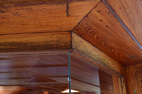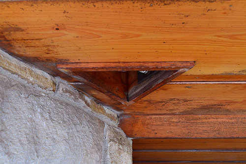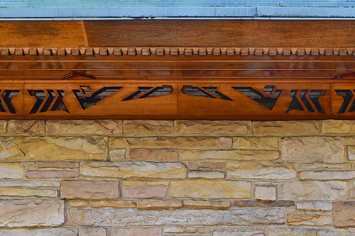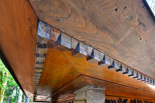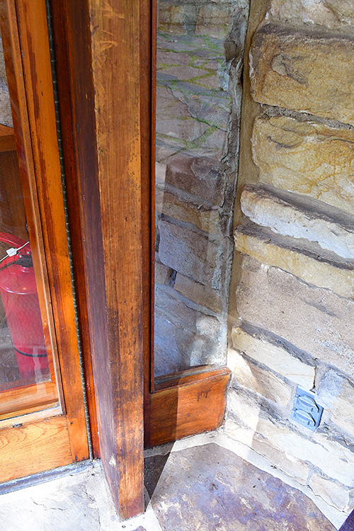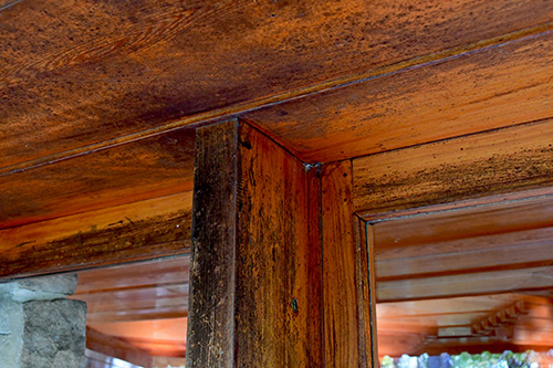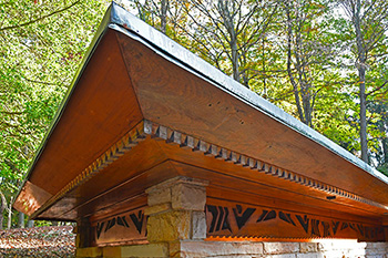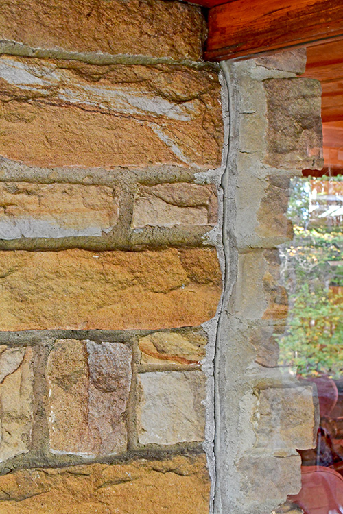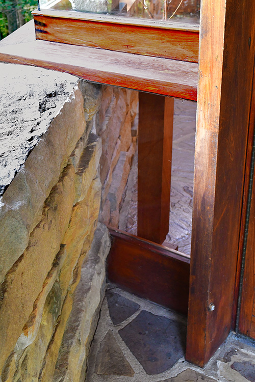 The floor is paved with flagstone, the walls are crafted from sandstone in the style of Wright's Taliesin. The woodwork throughout the space showcases exceptionally fine craftsmanship, particularly evident in the trellis that runs alongside the living room and dining area. The interior partitions are constructed using a board and batten technique. The roof features a hip design sheathed in copper.