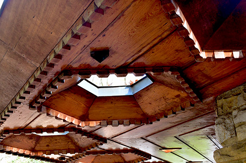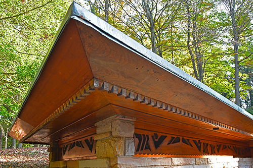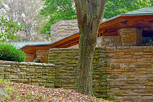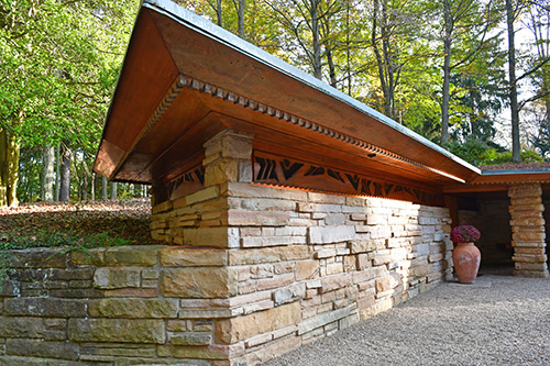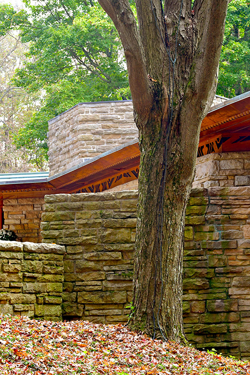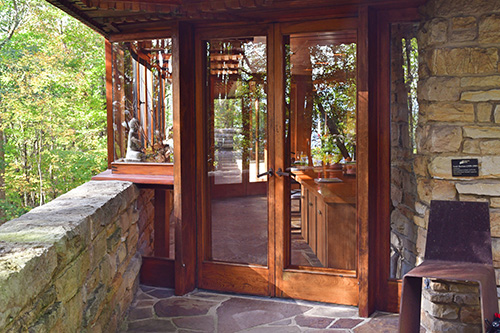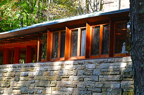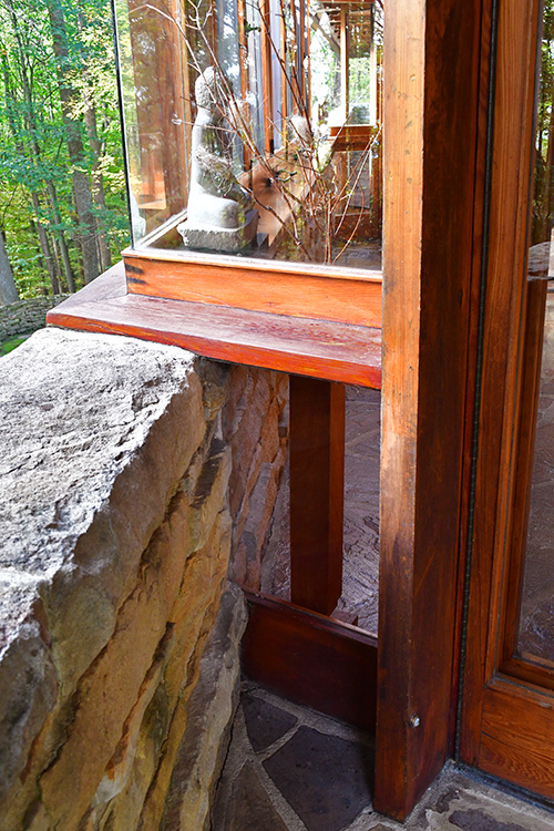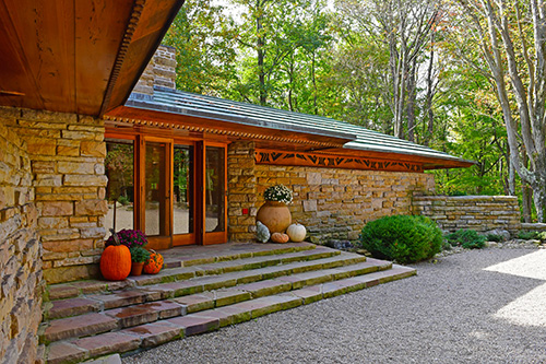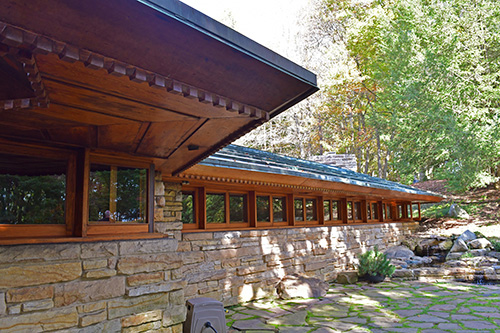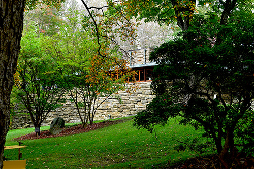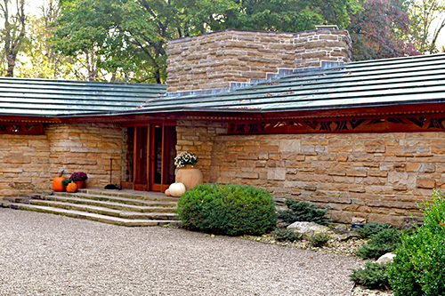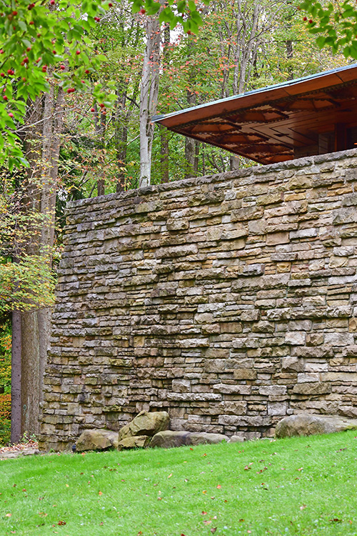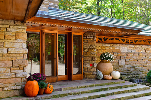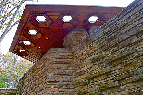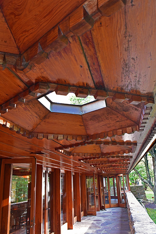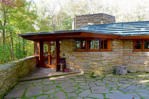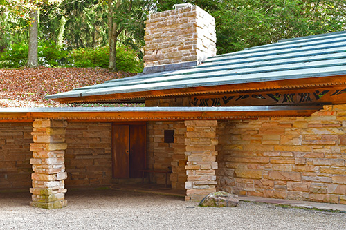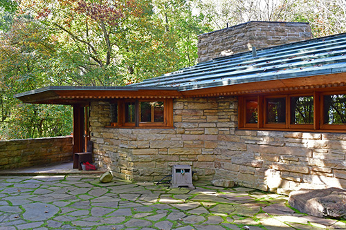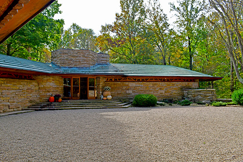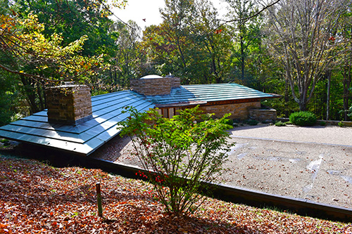 Unfortunately, we were unable to photograph the interior of Kentuck Knob, which serves as a museum showcasing an impressive collection of Frank Lloyd Wright artifacts. This collection features original Wright-designed chairs, furniture, drawings, art glass, and Minic Heritage Henredon prototypes.