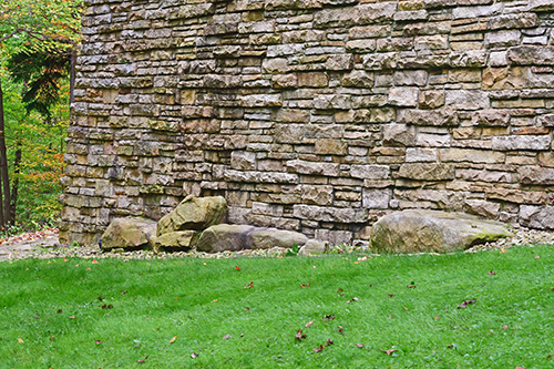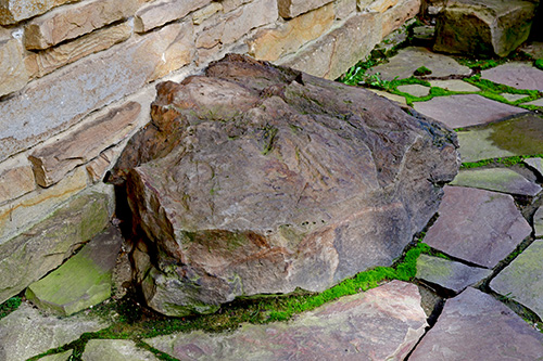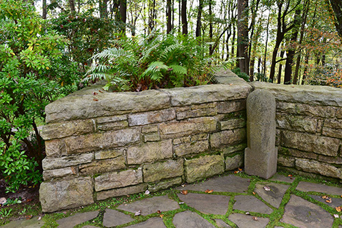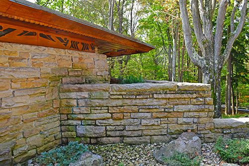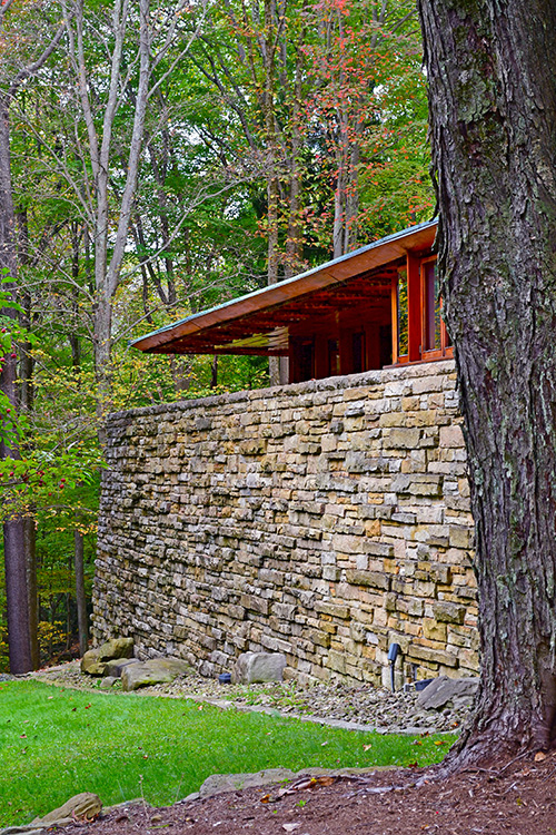 But the Hagan house, on its hill crown overlooking hundreds of acres of beautiful Pennsylvania forests - not far from Fallingwater - grew to be an especially elegant work, most particularly in its fine stone masonry and beautiful carpentry. The plan wraps around a gravel entry court, with carport at one end, entrance in the center, living room at the other end. The tall masonry-enclosed workspace is part, as usual, of the livingroom fireplace mass. Both dining and living rooms give onto a stone terrace that commands the view of the surrounding land-scape. The working drawing elevations clearly reveal the great amount of stonework employed in this dwelling, with a gentle hipped roof that lends a sense of serene shelter above the drama of the stone masonry.” Frank Lloyd Wright Monograph 1951-1959, Pfeiffer, 1988.