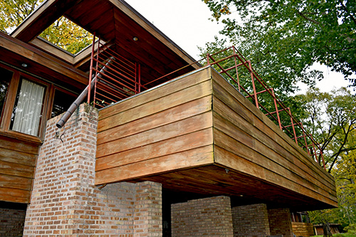 Description: View of cantilevered balcony and South side of home. Stamped on verso: "Aug 14, 1959". Clipping on verso: "Architectural students from all over the world make pilgrimages to Chicago where Wright built houses for more than half a century. He built this one in 1940 on the banks of the Des Plaines River near Libertyville for the late Lloyd Lewis and Mrs. Lewis. The overhanging roofs and cantilevered balconies are typical. (Sun-Times Photo by Carmen Reporte)." Acquired from the archives of the Chicago Sun Times.