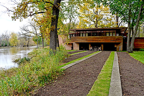 Bruce Brooks Pfeiffer wrote: “Now again in 1940, as in 1900, he was building for the prairie condition, intensified here because of the marsh and the adjacent river. For his friend he created one of the loveliest homes he ever designed, and both Lloyd Lewis and his wife Kathryn lived in the house in a beautiful setting, with every detail and feature designed by their architect-friend... the result shows such a marvelous interior harmony, and peaceful blending with the wooded site, that the house truly became a tribute to both of them and their friendship.” Frank Lloyd Wright Monograph, 1937-1941, 1986/1990, p.170.