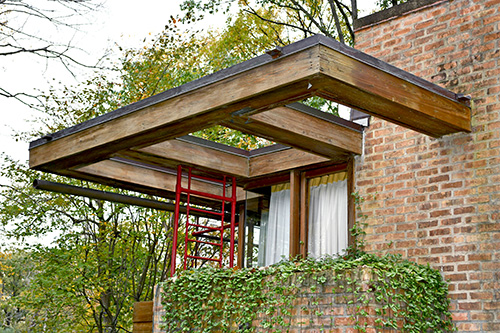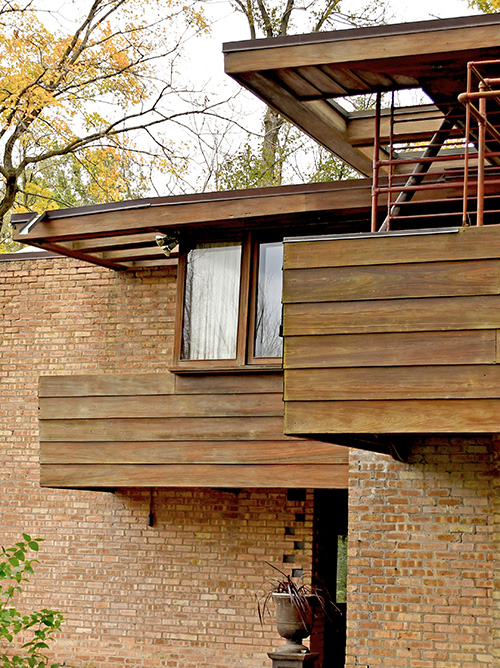 Description: Exterior view of the Lloyd Lewis Residence. Designed in 1939, the upper screened terrace cantilevers out over the Loggia below. Photographed by Wayne Andrews, published in "Architecture, Ambition and Americans" p.241, which was first published in 1947. Label pasted to face: "University of California, Berkeley. 20th Century - United States. Wright, Frank Lloyd. Lloyd Lewis Residence. Libertyville, Illinois. 1940. Close-up. Andrews 389. Department of Architecture." Acquired from the archives of the University of California, Berkeley.