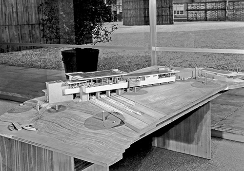 Description: A traveling exhibition of Wright's work, consisting of models, photographs and original drawings. A Preview of the exhibition was held in Philadelphia (January 1951). The world wide tour opened in Palazzo Strozzi Florence, Italy (June 1951). In "Sixty Years" (New York), Wright notes that from Florence the Exhibition traveled to "Switzerland, France, German and Holland". The Exhibition catalogs are dated: Paris (April 1952), Zurich (End of May 1952), Munich (May 16 - June 15, 1952), and Rotterdam (dated June 1, 1952). After two years in Europe the exhibition crossed the Atlantic to Mexico City, then to New York (1953). After an exhibition in Los Angeles, June, 1954, the final exhibition took place in Chicago, October, 1956. The Los Angeles exhibition premiere was held at Barnsdall Park' Municipal Art Center on June 1, 1954, then open to the public from June 2 to July 11, and was extended to July 25, 1954. A temporary pavilion, similar to the pavilion in New York, was attached to the line of kennels that reached from the house to the garage. Exhibition Model #67. "Model of Lloyd Lewis House, Libertyville, Ill., 1939." Sixty Years of Living Architecture Exhibition, Los Angeles 1954. Model of the Lloyd Lewis House. Photographed by Loch Crane in June, 1954.