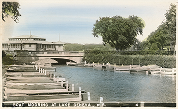 The Whiting House, built in the early 1870s was destroyed by fire in 1894. This is the original property where the Hotel Geneva was built. Boat landing with Whiting House in background. Shows original lagoon in front of the Whiting House. Postcard printed in Germany and published by James Leonard Publishing, Lake Geneva, Wis. See additional information about the Whiting House. Original aerial view drawing drawing. "Frank Lloyd Wright Monograph 1907-1913", Vol. 3, Pfeiffer, Futagawa, Yukio, 1991, page 189-191.