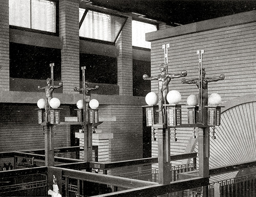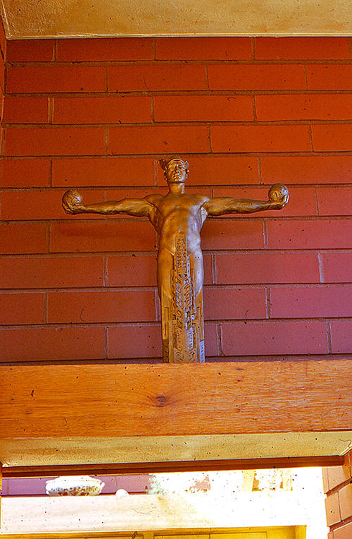 Description: Frank Lloyd Wright's design for the bank featured four "Spirit of Mercury" statues positioned over the teller cages. Sculpted by Richard Bock, these figures were ingeniously incorporated into light fixtures. The statues were illuminated by the reflection of light off art glass bands embedded in the brickwork. When the building was remodeled in 1926, the four statues were removed. One statue went to the library. Another to a Wright-designed Trier Residence (1956 - S.398) in Johnston, Iowa.