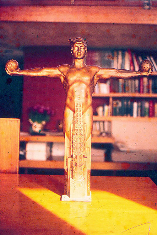 Description: View of the bronze sculpture "Spirit of Mercury" created by Richard Bock. Wright's design for the bank included four "Spirit of Mercury" statues over the teller cages in the building. When the building was remodeled in 1926, the four statues were removed. One statue went to the library. Another to a Wright-designed Trier Residence (1956 - S.398) in Johnston, Iowa. This was photographed in the Trier Residence. Text on sleeve: "Wright, F. L. - City National Bank, 7-1. The Spirit of Mercury. Full view. Bock, Richard. Bronze. Private collection of Paul Trier. U of Virginia FAIC." Acquired from the archives of the University of Virginia. See Additioal Information about the Spirt of Mercury...