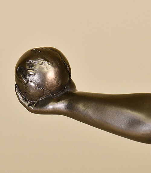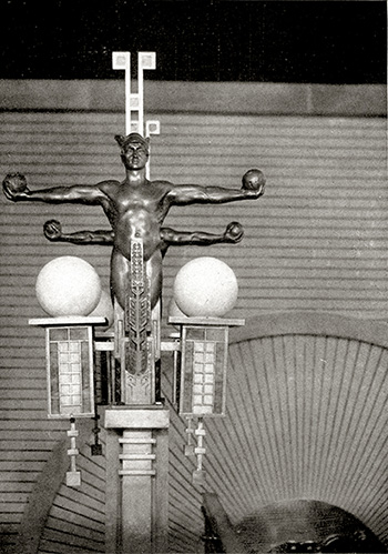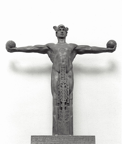 Mercury, the god of Greek mythology was a son of Zeusand fostered abundance and prosperity, and consequently was adopted as the patron of commerce and finance. He has always been depicted as a slim youth of nervous disposition and fleet of foot, serving as messenger to the gods. His field of action was varied and manifold and not always creditable to himself. In applying the spirit of Mercury to our modern purposes (symbol-ically speaking) he serves the purpose of the general development of the money power, and like it springs from the soil to organic shape to become that tremendous factor, the all powerful domineering spirit of the time, to whom kingdoms bow and nations tremble. The figure therefore is depicted as rising straight like a plant out of the ground assuming shape as it develops and crystallizes, this being emphasized by the chrystal forms clinging to the figure much in the nature of a chrysalis. The upper part of the figure shows it to be of unusual strength upon whose powerful straight arms, lever-like, the world is balanced. The head-dress of wings and dolphin head are characteristic of Mercury as represented by the ancients.