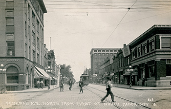 This postcard was written on December 30, 1922 and postmarked “Jan 5 1923.” The “Laird Clothes” sign seen on the corner of the City Bank Building in the 1924 postcard is not yet present. Text on face: “Federal Ave. North From First St. South, Mason City, IA. 863.” Text on verso: “Post Card. Correspondence. Address Only.” Vertical text on left: Co-Mo Photo Company, Mason City, Iowa.” Real Photo Post Card.