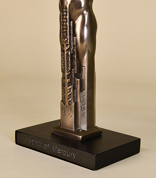Text on base: “Spirit of Mercury.” 11" High x 10.5" Wide x 2" Deep. Base: 5.625 Wide x 3.75" Deep x .75" High.