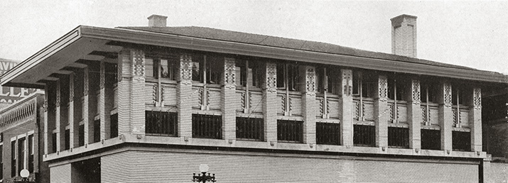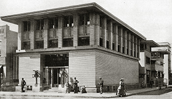 In 1907, when the two law partners were looking for an architect to compete in quality with the eight-story bank building that would be built across the corner by a competing bank, they didn't hesitate to give the commission to Frank Lloyd Wright, the young architect who was building a reputation in the Chicago area. For them he would build a complex, multi-purpose building that would give them multiple income streams. Their office would be on the second floor of its central waist surrounded on the east by a two-story banking room with rental office space above and a 42-room hotel on the west with basement shops beneath the two major building segments. He managed to pack all these functions into an aesthetically well-integrated building that architecturally would be the bridge between the Prairie School and Midway Gardens and the Tokyo Imperial Hotel to follow.