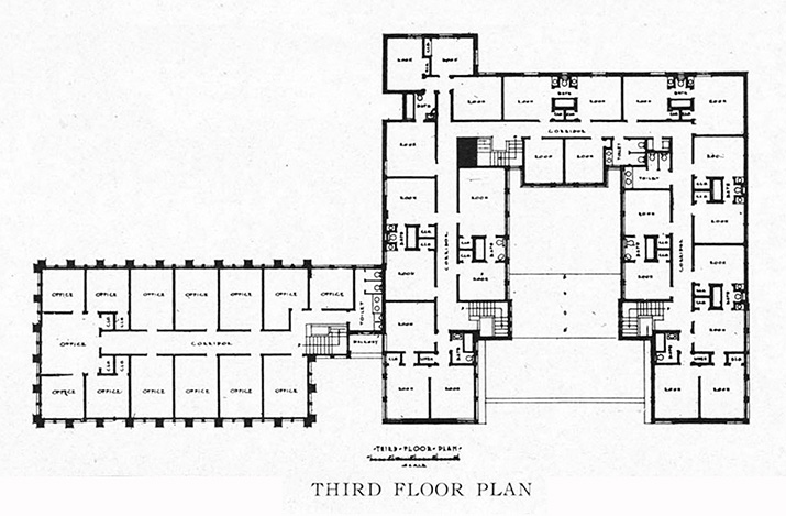 A mezzanine room or balcony overlooking the office and cafe where the orchestra plays on special occasions, utilized for rest and writing room for the ladies parlor on the second floor that with French windows leads to a delicate balcony overlooking the park; and a spacious guest room for the gentlemen in the basement for reading and correspondence, well lighted and well ventilated are features which at once attract attention and elicit generous praise from the public.