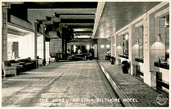Description: View of the Arizona Biltmore lobby. The carpet is this image is the same as 1929 - S#215.16. Text on verso: “Color Card. Kodachrome Reproductions by Mike Roberts for Intermountain Tourist Supply, Phoenix, Ariz. Lobby of the Arizona Biltmore Hotel, Phoenix, Arizona. VC996.” Mike Roberts published postcards from 1939-1996. Kodachrome was first developed in 1935.