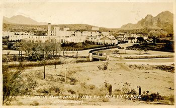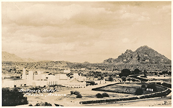 Description: Real Photo Post Card. Aerial view of the Arizona Biltmore from the South. Verso: “Post Card. For a birds eye view, a familiar landmark on the Arizona scene is the beautiful Arizona Biltmore Hotel, in Phoenix, famous winter resort. A Robert Markow photograph, Phoenix, Arizona.” Postmarked: “Feb 26 1948.” Even though postmarked 1948, the image appears to be earlier. Real Photo Post Card.