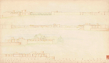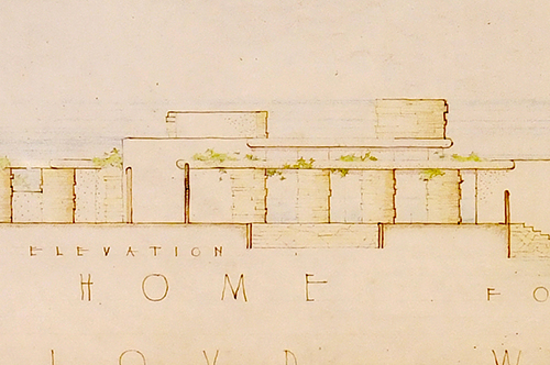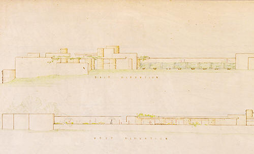 Description: Elevation of the Frank Lloyd Wright Desert Dwelling designed by Frank Lloyd Wright for himself in 1924. Photograph of original drawing in the Frank Lloyd Wright Archives. Text hand written: "Study for Desert Dwelling for FLLW. 1921 Los Angeles." Lower left: "2107.02." Published in