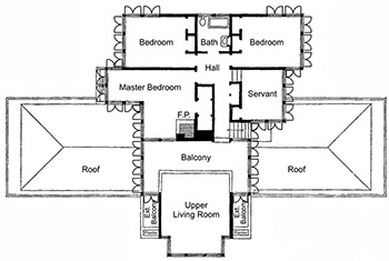 Description: Floor plan for the second level of the Steffens Residence. Designed by Frank Lloyd Wright in 1909. As you reach the top of the stairs, turn left and you enter the Balcony which overlooks the Living Room. On either side of the balcony, doors lead out to an exterior Balcony with built-in planters. Bedrooms and the Bath were reached by turning right at the top of the stairs. A row of art glass clerestory windows were recessed just beneath the roof line. Courtesy of "Frank Lloyd Wright, Ausgeführte Bauten (Executed Buildings)", 1911. Modified by Douglas M. Steiner. See Additional Information...