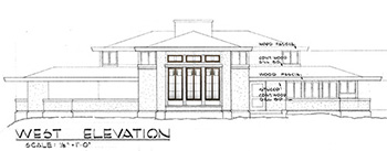 Comparing Wright's original elevations to the 1963 HABS allows us the opportunity to see alterations, many of which were completed during construction. It also gives details of finished construction materials, trim details, roof overhangs and windows sizes for all four sides. The Design of the Master Bedroom bay, hidden from view in existing photographs is exposed in these views. 4A) Sheet 4, West Elevation 1963. Lower Level: The covered Porch is on the far left, the Living Room in the center, the entrance just to the right, and the Dining Room is on the far right. Upper Level: The Master Bedroom is on the far left, the upper portion of the Living Room is in the center, with an exterior balcony on either side. A set of doors on either side lead from the interior Balcony to the exterior Balcony. The Bedrooms are on the far right. The Living Room windows were originally designed to run from floor to ceiling (see below), but alterations created a bay, with the top lining up with the base of the upper clerestory windows. Other alterations included reducing the number of windows on the upper level and narrowing the fireplace chimney. Courtesy of the National Park Service. 4A2) Wright's original drawing of the West Elevation. Lower Level: The covered Porch is on the far left, the Living Room in the center, the entrance just to the right, and the Dining Room is on the far right. Upper Level: The Master Bedroom is on the far left, the upper portion of the Living Room is in the center, with an exterior balcony on either side. A set of doors on either side lead from the interior Balcony to the exterior Balcony. The Bedrooms are on the far right. The Living Room windows were originally designed to run from floor to ceiling, but alterations created a bay (see 4A), with the top lining up with the base of the upper clerestory windows. Other alterations included reducing the number of windows on the upper level and narrowing the fireplace chimney. Courtesy of the Frank Lloyd Wright Foundation. 4B) Sheet 4, East Elevation 1963. Lower Level: The Dining Room is on the far left. The enclosed rear Porch and Utility and Storage Rooms are in the center, and the covered Porch is on the far right. Upper Level: Bedroom are on the left and right, with the Bath in the center. The Master Bedroom is on the far right. The number of windows on the upper and lower levels were reduced dramatically. Courtesy of the National Park Service. 4B2) Wright's original drawing of the East Elevation. Lower Level: The Dining Room is on the far left. The enclosed rear Porch and Utility and Storage Rooms are in the center, and the covered Porch is on the far right. Upper Level: Bedroom are on the left and right, with the Bath in the center. The Master Bedroom is on the far right. Wright designed he upper level with a row of clerestory windows that ran the full length from North to South. He also included more windows on the lower level. Courtesy of the Frank Lloyd Wright Foundation. 4C) Sheet 4, North Elevation 1963. Lower Level: The Utility and Storage Rooms are on the far left. The covered Porch is in the center, the Living Room is on the right. Upper Level: One of the Bedrooms is on the far left. The larger windows are part of the Master Bedroom as are the next two sets of smaller windows to the right. The last three sets of windows above the covered Porch are for the Living Room Balcony. To the right is the exterior Balcony and the Living Room Bay. The Living Room windows were originally designed to run from floor to ceiling (see below), but alterations created a bay, with the top lining up with the base of the upper clerestory windows. Courtesy of the National Park Service. 4C2) Wright's original drawing of the North Elevation. The home was built on the top of a "ridge", the highest point on the lot. Wright's original drawing highlights this "ridge". Lower Level: The Utility and Storage Rooms are on the far left. The covered Porch is in the center, the Living Room is on the right. Upper Level: One of the Bedrooms is on the far left. The larger windows are part of the Master Bedroom as are the next two sets of smaller windows to the right. The last three sets of windows above the covered Porch are for the Living Room Balcony. To the right is the exterior Balcony and the Living Room Bay. The Living Room windows were originally designed to run from floor to ceiling (see 4C), but alterations created a bay, with the top lining up with the base of the upper clerestory windows. Courtesy of the Frank Lloyd Wright Foundation. 4D) Sheet 4, South Elevation 1963. Lower Level: The Living Room and Entrance are on the left, the Dining Room is in the center, the Kitchen is to the right, and the enclosed rear Porch is on the far right. The door to the rear Porch gave access to the home from the alley. Upper Level: The exterior Balcony is on the left. The Living Room Balcony is above the Dining Room. Bedrooms are to the right. The Living Room windows were originally designed to run from floor to ceiling (see below), but alterations created a bay, with the top lining up with the base of the upper clerestory windows. Courtesy of the National Park Service. 4D2) Wright's original drawing of the North Elevation. Lower Level: The Living Room and Entrance are on the left, the Dining Room is in the center, the Kitchen is to the right, and the enclosed rear Porch is on the far right. The door to the rear Porch gave access to the home from the alley. Upper Level: The exterior Balcony is on the left. The Living Room Balcony is above the Dining Room. Bedrooms are to the right. The Living Room windows were originally designed to run from floor to ceiling (see 4D), but alterations created a bay, with the top lining up with the base of the upper clerestory windows. Courtesy of the Frank Lloyd Wright Foundation. FIREPLACES (SHEETS 2-3)