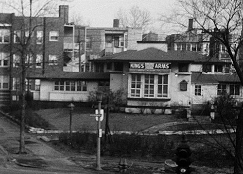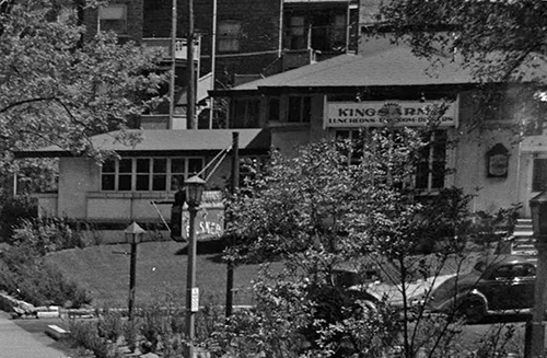 Most likely photographed around 1940 on a warm Winter or Spring day. Snow is melting and and clientele for the local apartment complexes are plentiful. Sandy Goldman, reminiscing about the Rogers Park Community wrote, the "...King’s Arms restaurant (great food; great bar) stood on a hill at the S.E corner..."