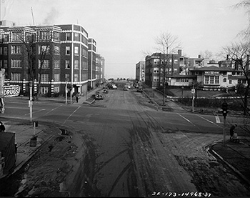 1) Oscar Steffens Residence, Chicago, Illinois, Circa 1936 (1909 - S.153). Viewed from the West, looking toward Lake Michigan which can be seen at the end of the street. The Steffens House can be seen on the right. Designed by Frank Lloyd Wright in 1909. The Steffens would move from their home after just three years. The home was purchased by Otto C. Bach in August 1912. Otto Bach was the brother of another Wright client, Emil Bach (1915 - S.193), located on the same street, a couple miles south. Photographed on May 13, 1936 by the Illinois Department of Transportation. Courtesy of the IDOT. (S#0404.51.1225) 2) Detail of the Oscar Steffens Residence, Chicago, Illinois, Circa 1936 (1909 - S.153). Viewed from the West, looking toward Lake Michigan which can be seen at the end of the street. STEFFENS RESIDENCE 1937