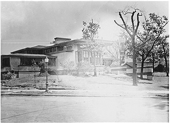 Description: Viewed from the Northwest, from Rogers Avenue. The covered Porch is on the left, Living Room in the center, and Dining Room on the far right. The entrance is on the right side of the Living Room. The Bedrooms are on the second level, seen above and behind the covered Porch and Living Room. Photographed by Henry Fuermann. Published in "Frank Lloyd Wright, Ausgeführte Bauten", 1911. See Additional Information...