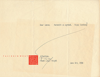 signed letter from Frank Lloyd Wright to Aaron Green on Taliesin