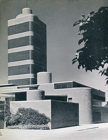 Pages 54-55: At the top of the page is the west front of the River Forest Golf Club, built at River Forest, Ill. Below this a perspective view of the new Abraham Lincoln Center, to be built on Oakwood Boulevard, at the Cor. Of Langley Avenue. Frank Lloyd Wright and Dwight Heald Perkins, Associated Architects. The ground floor is devoted to the various working societies of the parish; the space above, to the auditorium; above this the seminary rooms and quarters for those immediately connected with the church work. The top floor is a club room floor divided into large halls, with a mezzanine for gymnasium work. On the following page the Henderson House at Elmhurst, Ill., and below are two views of one of the main entrances to Lexington Terraces. The towers serve to light the terraces and approach. The interior court is lighted with similar towers in the re-entrant angles. The structure as a whole is to contain 328 flats; Average of four rooms each.
