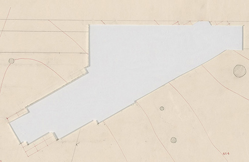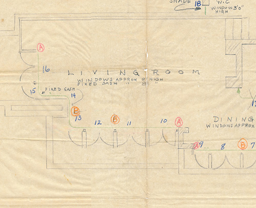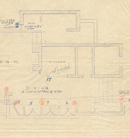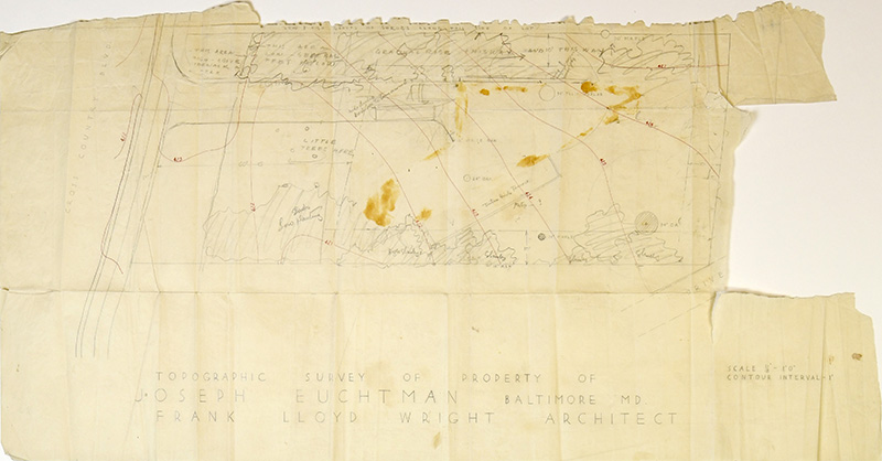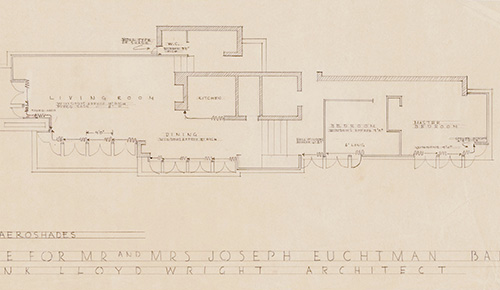 When we acquired a tissue fragment (S#501.65), of the original floor plan for the Joseph Euchtman Residence. As we were searching the Frank Lloyd Wright Archives at Avery Library, we came to sheet nine, this sheet, and were shocked. There was a gapping hole cut out of the drawing. We had never encountered this before. As we studied sheet #9, our first reaction was no, it can’t be. You have to be kidding. No way would Taliesin cut the floor plan out of an original drawing and send just that section to the client. A copy maybe? A blueprint maybe? But not a fragment of the original. We lined up the fragment with the hole and to our utter disbelief, it was a perfect fit. We let that settle in...