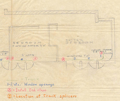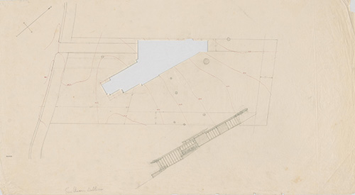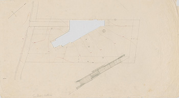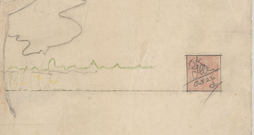 Size: Original floor plan illustration fragment, red ink and graphite on tissue, 11.5 x 4.5"
