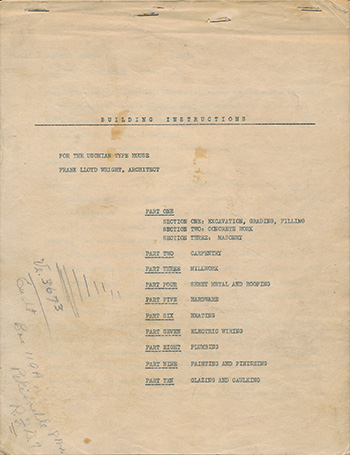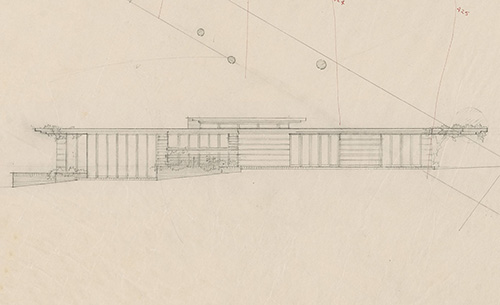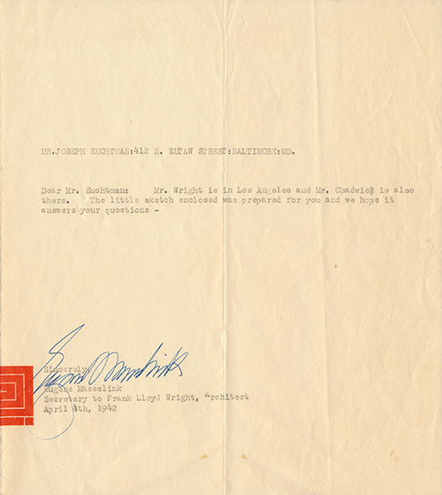 Accompanying the tissue fragment was a letter from Eugene Masselink, Taliesin West, to Joseph Euchtman S#593.25, “Dear Mr. Euchtman: Mr. Wright is in Los Angeles and Mr. Chadwick is also there. The little sketch enclosed was prepared for you and we hope it answers your questions.”