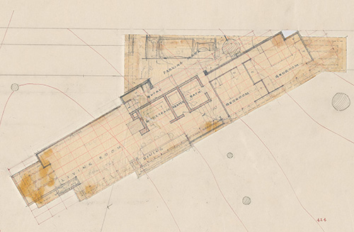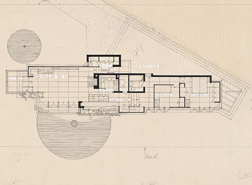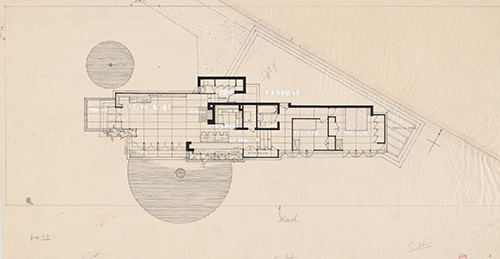 Description: Original floor plan illustration fragment for the Joseph Euchtman Residence. The Joseph Euchtman Usonian House is a long plan with the living space is on one end, with the bedrooms on the other. The entrance, workspace and dining area are in the center. It is 84 feet from one end to the other. The carport is turned at a 30 degree angle, intersects the house, and forms a trellis over the master bedroom's glass doors on the East end of the house.