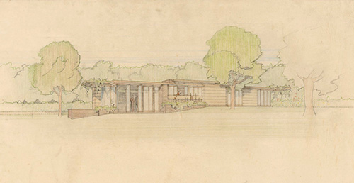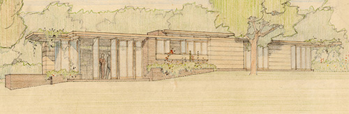 Description: View of the Dudley Spencer Residence. Designed by Frank Lloyd Wright in 1956. The first design, Scheme #1, an L-shaped Usonian house with a living room roof that slopes upward, was rejected by the Spencers. Scheme #2 was accepted. Scheme #2 is what Frank Lloyd Wright called a solar Hemicycle. Very similar to the Laurent (1949) and Pearce (1950) Residences. The Spencers moved into their home in 1959.