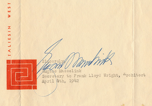 Title: Letter from Eugene Masselink to Mr. Joseph Euchtman, 1942, (1939 - S.270. Typed and signed on Taliesin West Letterhead by Eugene Masselink, dated April 4th, 1942.