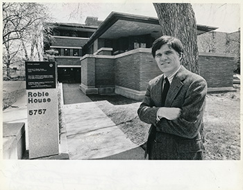 Description: View of the Robie House from the West. Curator Peter J. Kountz is in the foreground, the entrance is in the background. Clipping affixed to verso: “It's drafty as a barn; a deteriorating steel beam is pushing up the walls, and the ground-level bathroom is a mess.