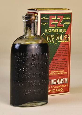 Packaging: “Trade E-Z Mark, Rust Proof Liquid. Stove Polish. Does It Easy. Martin & Martin, Carroll & Sacramento Aves., Chicago.” Text on flap: “New Style Package Adopted 1901.” The original box is printed in four color: Red, Green, Black, Yellow.