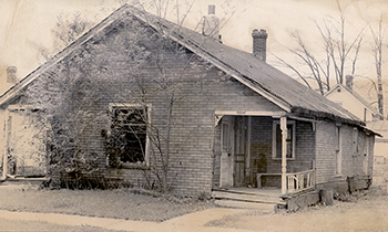 Description: Frank Lloyd Wright was born in Richland Center, Wisconsin on June 8, 1867. J.P. Kelly identified this house as Frank Lloyd Wright’s birthplace. Joseph William Koelsch photographed this house in 1967. It was demolished in the late 1980s. The photograph shows a very dilapidated house. It has fake brick veneer siding. There is one window in the front of the house, and a front porch on the right corner. The front door leads into the house, and a window behind the screen door...
