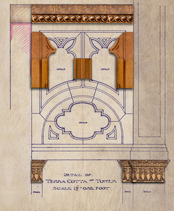 Description: Terra Cotta Tower Detail Plan illustrates the terra cotta detail of the stairway towers. Stairways were located within four towers at the interior corners. The stairways opened onto an upper balcony that framed the courtyard. Decorative terra cotta designs were above the opening from the stairwell to the balcony on all four corners, allowing additional light into the stairwell. Frank Lloyd Wright designed the Francisco Terrace Apartments for Mr. E. C. Waller.