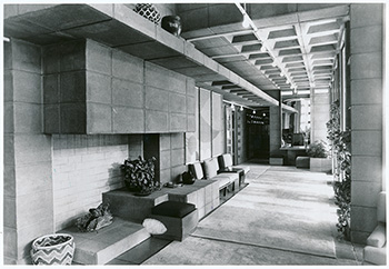 Description: Postcard. Viewed of the Living Room looking South. Designed by Frank Lloyd Wright in 1923, construction was supervised by Wright’s son, Lloyd Wright. A two-story home, the Entrance, Living Room, Balcony and Kitchen are on the main floor. The lower level includes two Bedrooms, Lounge, Bath and Storage. Both the West and East corners of the South elevation are formed by mitered glass corners that run the full length of two floors. This was Wright’s first use of mitered glass corners. Wright utilized this concept again in 1935 when he designed Fallingwater. Each textile block was 16" x 16". Wright continued the 16" measurement in the details of the design. Some blocks... Continue...