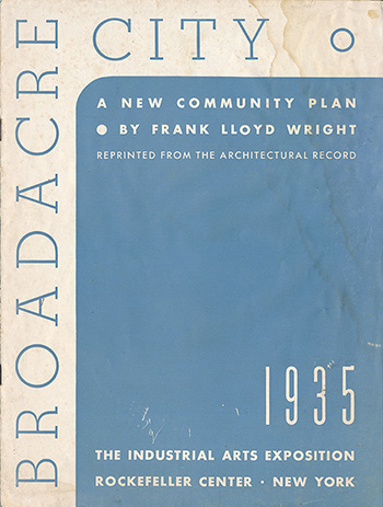 Description: “Broadacre City. A New Community Plan.” Published as an offset for the Industrial Arts Exposition in Rockefeller Center, New York, April 15 to May 15, 1935 where Broadacre was shown publicaly for the first time. It consisted of architectural models and a full model 12 by 12 feet in size, of Broadacre City itself, complete with tiny forests, homes, schools, factories and farms. Broadacre City was a plan for a decentralized community that Wright promoted endlessly from the 1930s to his death in 1959. He believed that everyone should have at least an acre of land and the right to beautiful housing and carefully organized cities that were spread out, not like the congestion of places like New Wright, Frank Lloyd York, a town he insulted more than once.