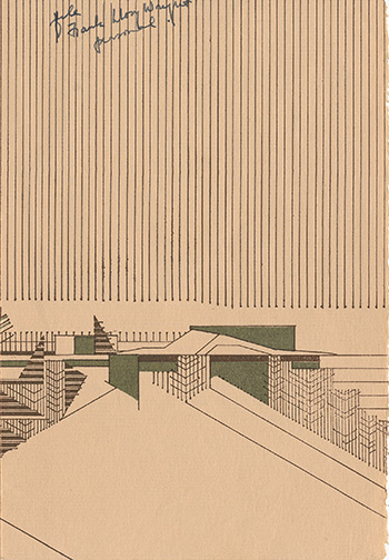 Designed and calligraphed by Wright, then photographically printed on vellum or rice paper and laminated to buff-colored card stock. A portrait of their daughter Iovanna Lazovich Lloyd Wright at upper left; one portion hand-colored in red (4.5 x 5.5"). Olga and Frank were married on August 25, 1928 at midnight in Rancho Santa Fe near La Jolla. The ceremony was held one year to the day after Wright's divorce from Miriam Noel Wright, and almost three years after their daughter Iovanna (shown in the hexagonal portrait) was born (December 2, 1925 in Chicago, Illinois). They honeymooned in Phoenix, Arizona at the Arizona Biltmore Hotel.