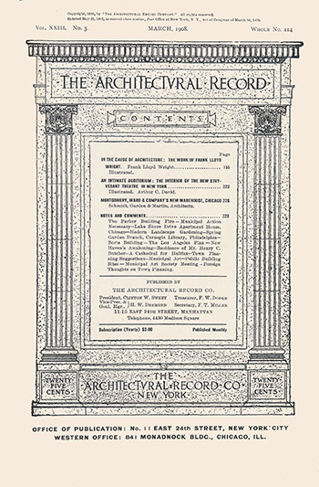 Description: An Architectural Pioneer: Review of the Portfolios containing the works of Frank Lloyd Wright." Book review of the 1910 Wasmuth portfolios. "Such works of Frank Lloyd Wright as he thinks worth preserving in pictorial presentation, and as probably profitable for doctrine, for reproof, for correction, for instruction in righteousness, have just been issued in two large and handsome portfolios, from the press of Ernst Warmuth [s.i.c.] in Berlin... Meanwhile, it is hard to see how an unprejudiced inquirer can deny that such designees as Mr. Sullivan and Mr. Wright have the root of the matter, and that their works are of good hope, in contrast with the rehandling and rehashing of admired historical forms in which there is no future nor any possibility of progress." Includes 12 illustrations from the Wasmuth Portfolios. Original cover price 25c. (Sweeney 91)