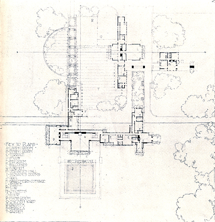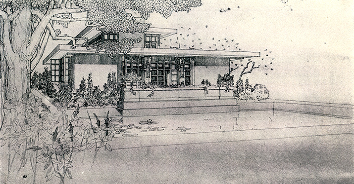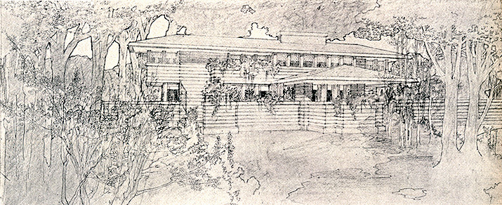 Description: The Home of an Artist-Architect. Louis H. Sullivan's Place at Ocean Springs, Mississippi.” Although attributed to Louis Sullivan, it has been recognized as a design by Frank Lloyd Wright. “Down in the sunny South, between New Orleans and Mobile, where the sparkling waters of the Gulf of Mexico makes one of its beautiful indentations, Biloxi Bay, girt by beach of golden sand and dark green pine trees, there lies a little tract of land some three hundred feet wide and eighteen hundred feet deep, in the midst of a forest.