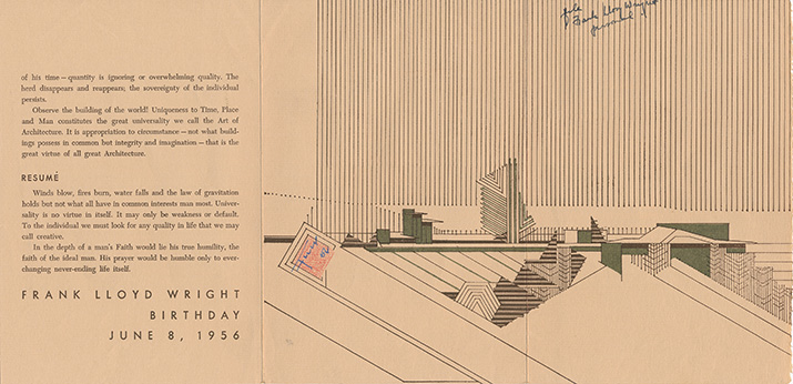 Description: Facsimile of 1933 Version by Taliesin Fellowship, Taliesin West. One difference is that this does not have the address flap for mailing. Includes mailing envelope.