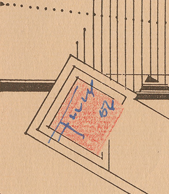 Description: Vertical Envelope with partial solid red square and text: "Taliesin Spring Green Wisconsin. Contents: Printer’s Proof. This package may be opened for Postal Inspection if necessary." Acquired from the estate of David Henken. David Henken was a Taliesin apprentice from 1942 and 1943. David and his wife Priscilla Henken arrived at Taliesin on October 1, 1942, and according to Taliesin Diary, A Year With Frank Lloyd Wright, Henkin, 2012, stayed there one year. Possibly acquired when Henken was an apprentice at Taliesin from 1942-43. (Two copies)
